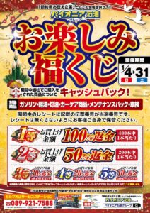 お楽しみ福くじ内容 開催期間 2026年1月4日(日)~1月31日(土) 対象商品 ガソリン・軽油・灯油・カーケア商品・メンテナンスパック・車検 内容 期間中の購入レシートに記載された伝...